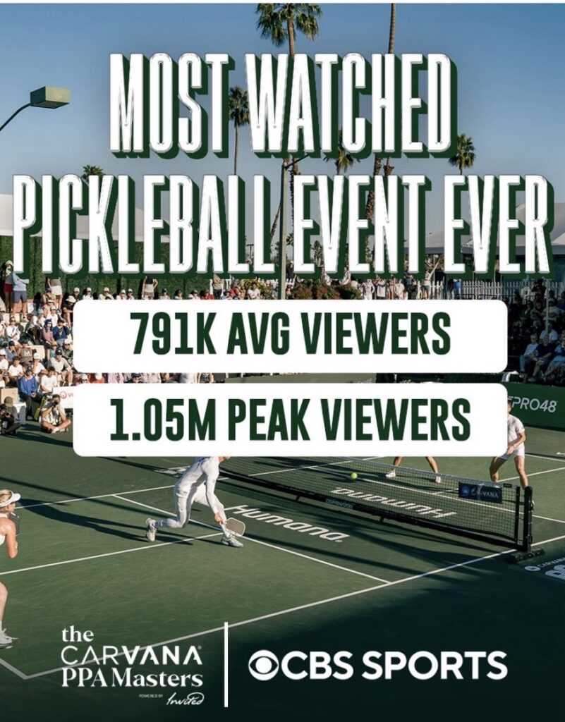 Pardoe also noted that it beat out other major sports at the same time slots including the NBA on Amazon Prime, Big12 Women’s Basketball on Fox, Premier League Soccer on USA Network and LIGA MX on Univision. Awesome! Pickleball to the moon!