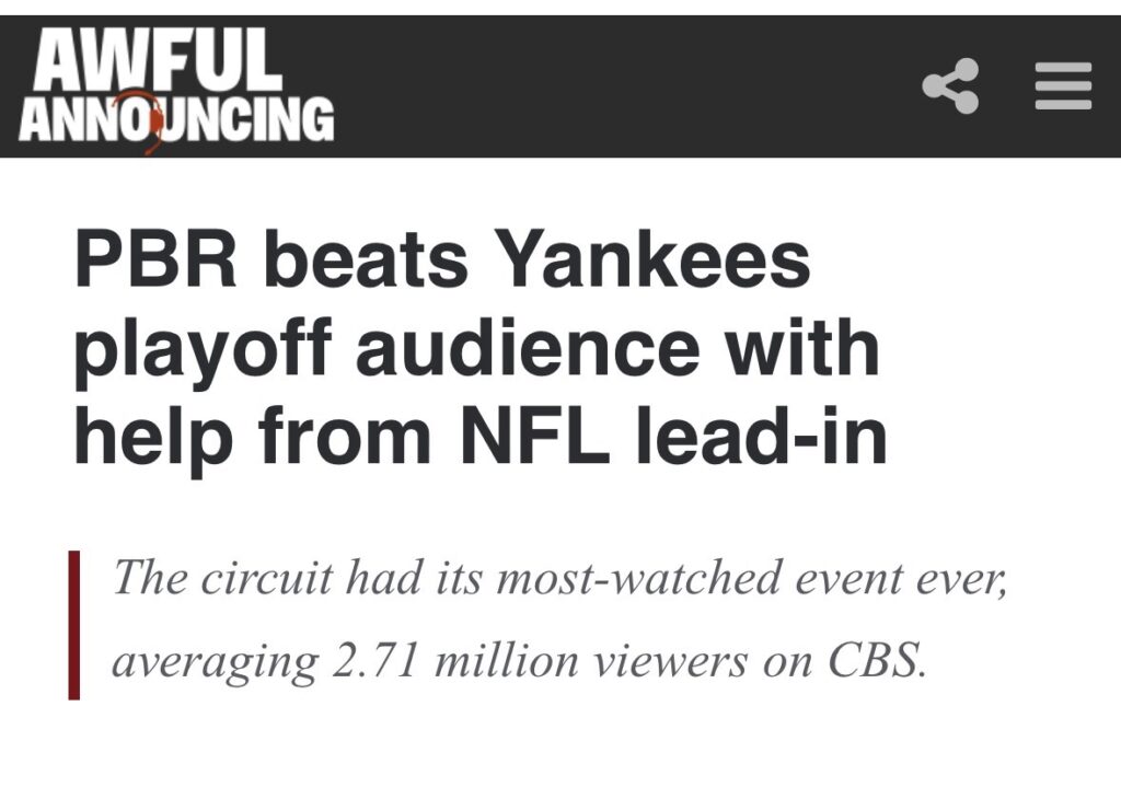 Pardoe excitedly exclaimed in his post that this demonstrates pickleball has “arrived” while also tagging a CBS Sports executive in his post. Well, do we think PBR bull riding, the team based rodeo sport, has arrived? A quick Google search will show you that in October 2025 a PBR event hit a record viewership number on CBS at 2.71 million viewers, which beat out the Yankees-Blue Jays playoff game 2 in a similar afternoon time slot.