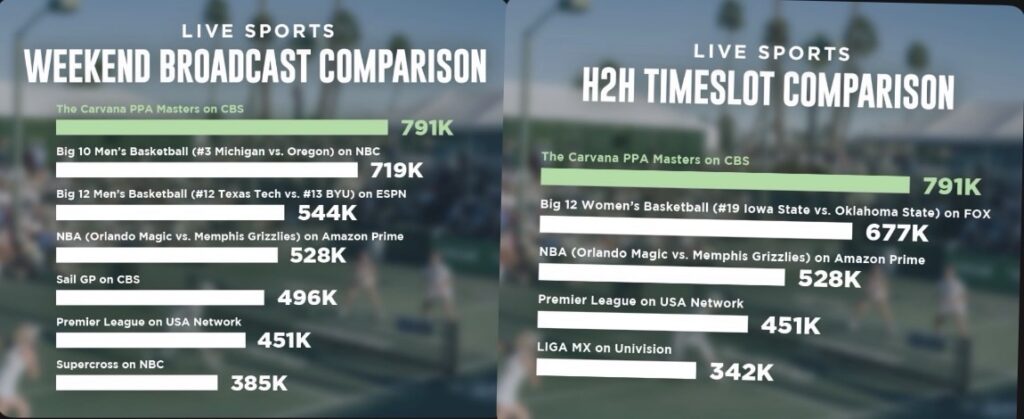 The only head-to-head time slot on an equivalent network that the PPA broadcast beat out was the Big 12 women’s college basketball game on Fox. In contrast, averaging over 500,000 plus viewers on Amazon Prime for an NBA game is actually a good chunk of viewers when you consider those people have to find and specifically tune in for that NBA game.