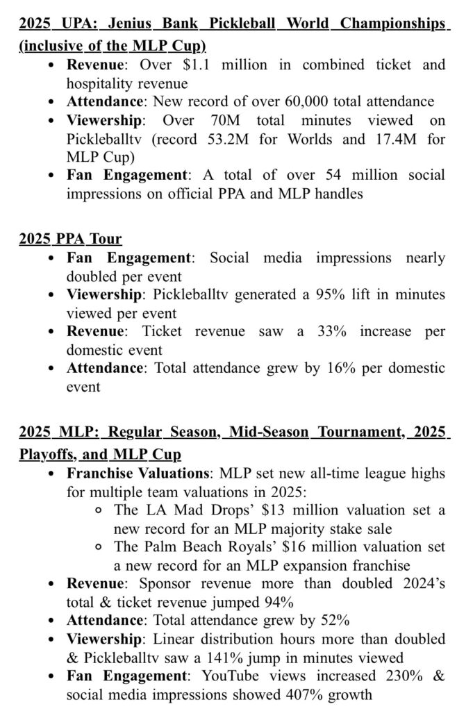 The real measurement for pickleball’s growth is in the Pickleball TV numbers that are not shared publicIy, other than what the UPA provided recently in a press release near the beginning of the year outlining the purported growth of its product. Notably, the primary metric used in presenting their growth was limited to “totals”, such as total ticket and hospitality revenue, and total minutes viewed on Pickleball TV.